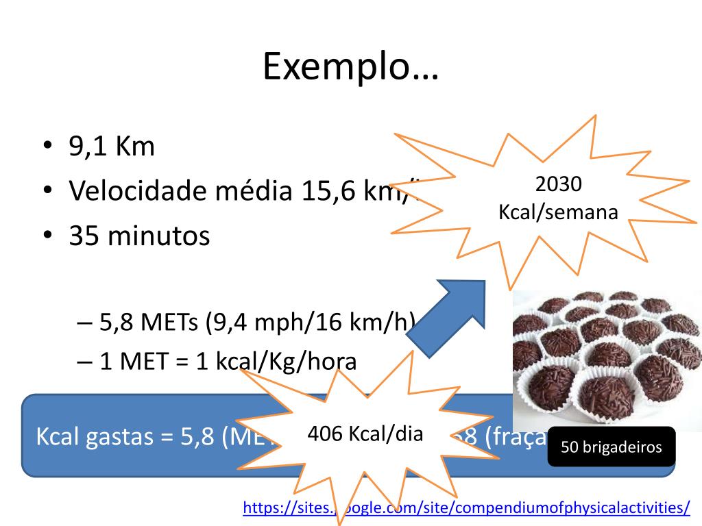 Exemplo… • 2030 Kcal/semana • 9,1 Km • Velocidademédia 15,6 km/h • 35 minutos • 5,8 METs (9,4 mph/16 km/h) • 1 MET = 1 kcal/Kg/hora 406 Kcal/dia Kcal gastas = 5,8 (METS) * 60 (Kg) * 0,58 (fração de hora) 50 brigadeiros https://sites.google.com/site/compendiumofphysicalactivities/