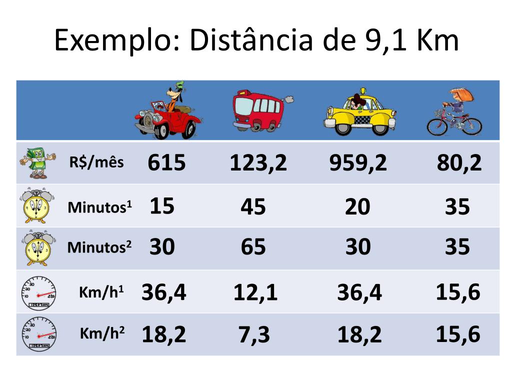 Exemplo: Distância de 9,1 Km 615 123,2 959,2 80,2 R$/mês 15 45 20 35 Minutos1 30 65 30 35 Minutos2 15,6 36,4 12,1 36,4 Km/h1 15,6 18,2 7,3 18,2 Km/h2