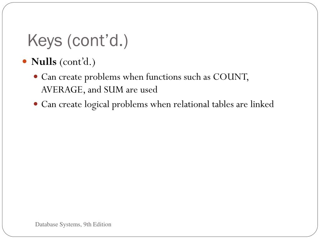 Keys (cont’d.) • Nulls (cont’d.) • Can create problems when functions such as COUNT, AVERAGE, and SUM are used • Can create logical problems when relational tables are linked Database Systems, 9th Edition