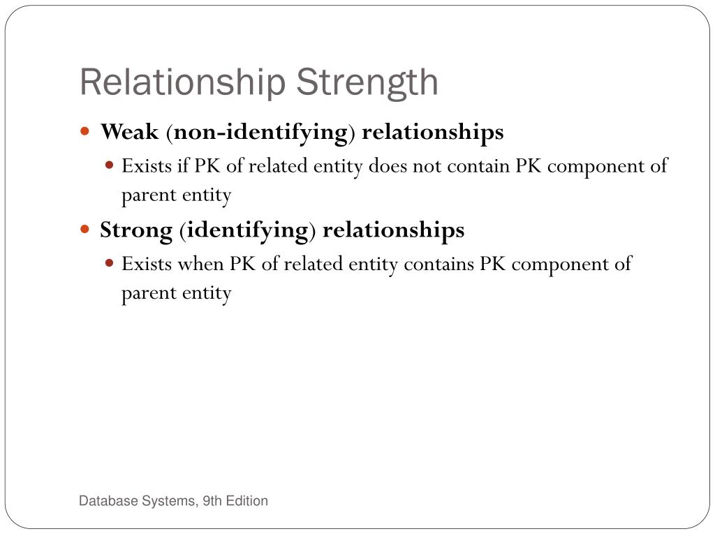Relationship Strength • Weak (non-identifying) relationships • Exists if PK of related entity does not contain PK component of parent entity • Strong (identifying) relationships • Exists when PK of related entity contains PK component of parent entity Database Systems, 9th Edition