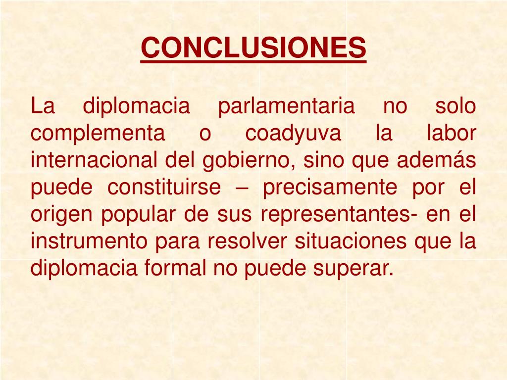CONCLUSIONES La diplomacia parlamentaria no solo complementa o coadyuva la labor internacional del gobierno, sino que además puede constituirse – precisamente por el origen popular de sus representantes- en el instrumento para resolver situaciones que la diplomacia formal no puede superar.