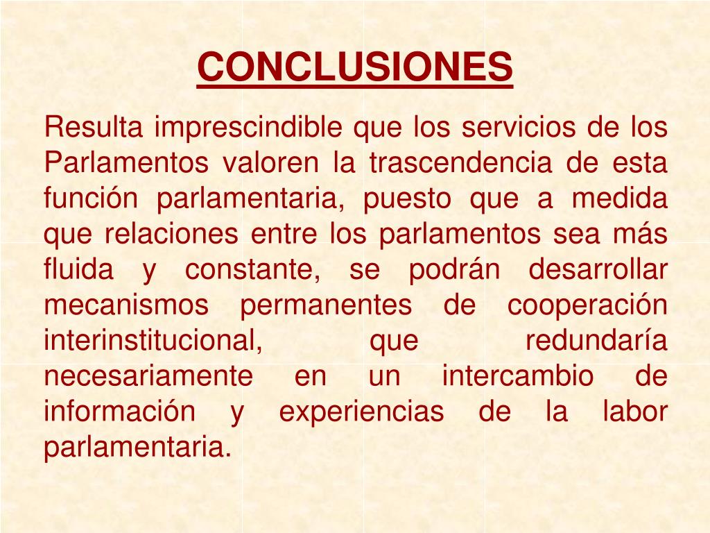 CONCLUSIONES Resulta imprescindible que los servicios de los Parlamentos valoren la trascendencia de esta función parlamentaria, puesto que a medida que relaciones entre los parlamentos sea más fluida y constante, se podrán desarrollar mecanismos permanentes de cooperación interinstitucional, que redundaría necesariamente en un intercambio de información y experiencias de la labor parlamentaria.