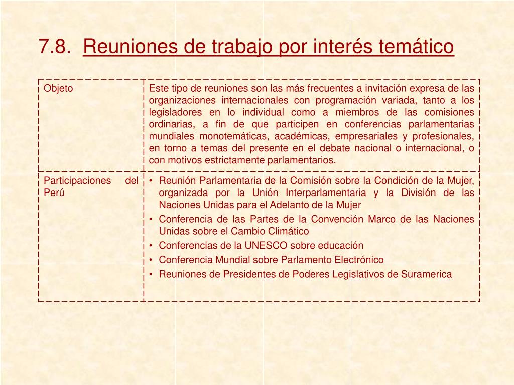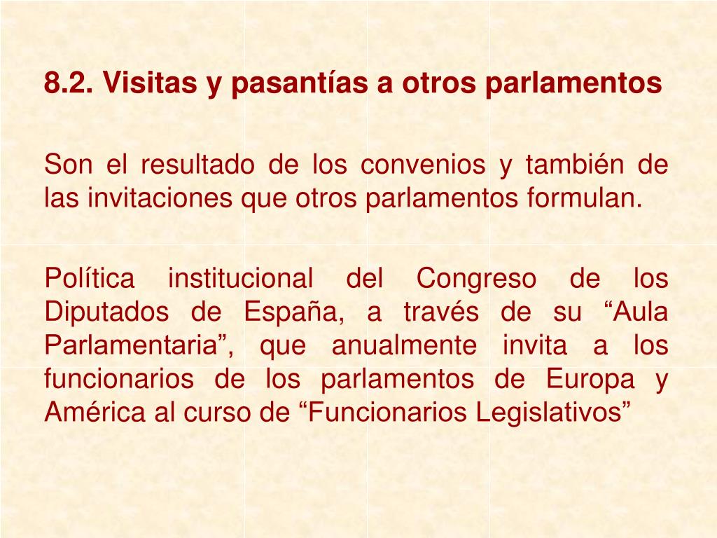 8.2. Visitas y pasantías a otros parlamentos Son el resultado de los convenios y también de las invitaciones que otros parlamentos formulan. Política institucional del Congreso de los Diputados de España, a través de su “Aula Parlamentaria”, que anualmente invita a los funcionarios de los parlamentos de Europa y América al curso de “Funcionarios Legislativos”