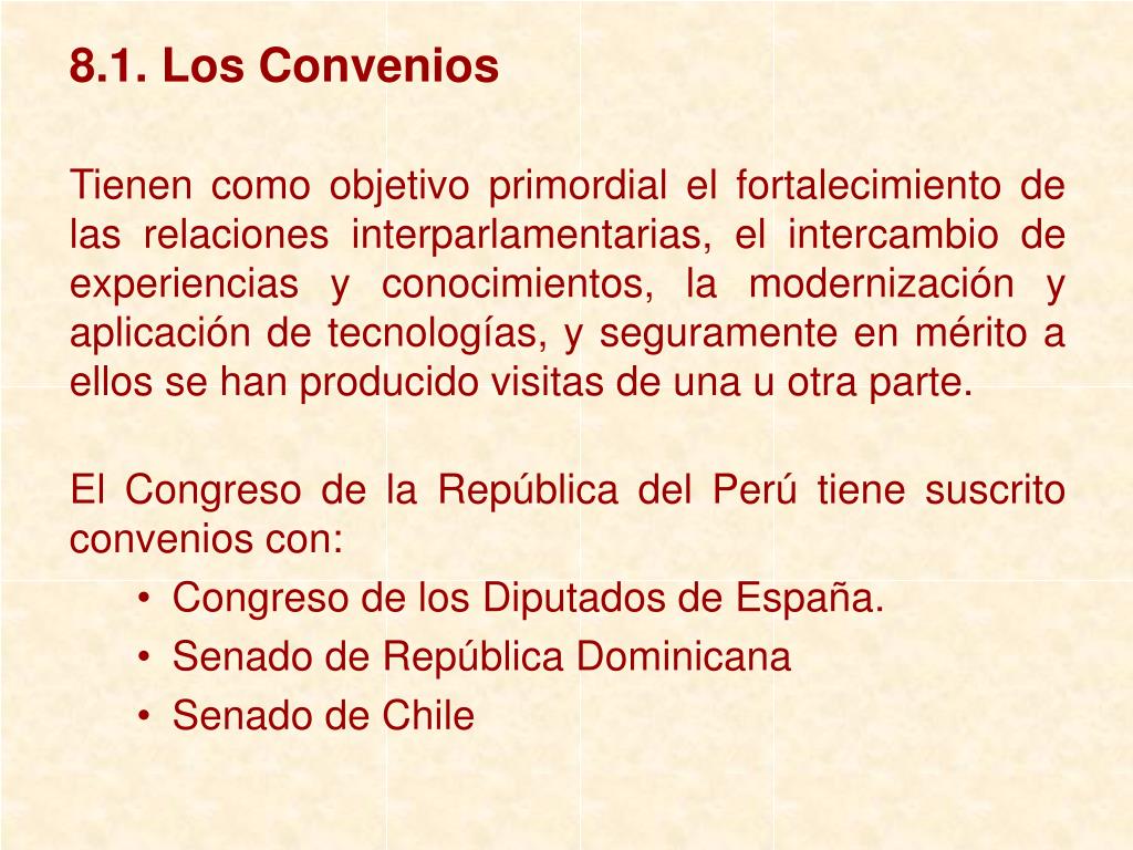 8.1. Los Convenios Tienen como objetivo primordial el fortalecimiento de las relaciones interparlamentarias, el intercambio de experiencias y conocimientos, la modernización y aplicación de tecnologías, y seguramente en mérito a ellos se han producido visitas de una u otra parte. El Congreso de la República del Perú tiene suscrito convenios con: • Congreso de los Diputados de España. • Senado de República Dominicana • Senado de Chile