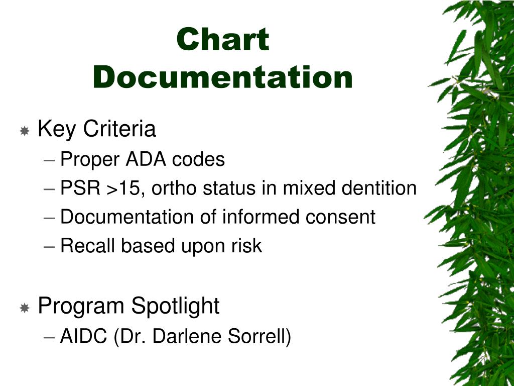 ChartDocumentation • Key Criteria • Proper ADA codes • PSR >15, ortho status in mixed dentition • Documentation of informed consent • Recall based upon risk • Program Spotlight • AIDC (Dr. Darlene Sorrell)