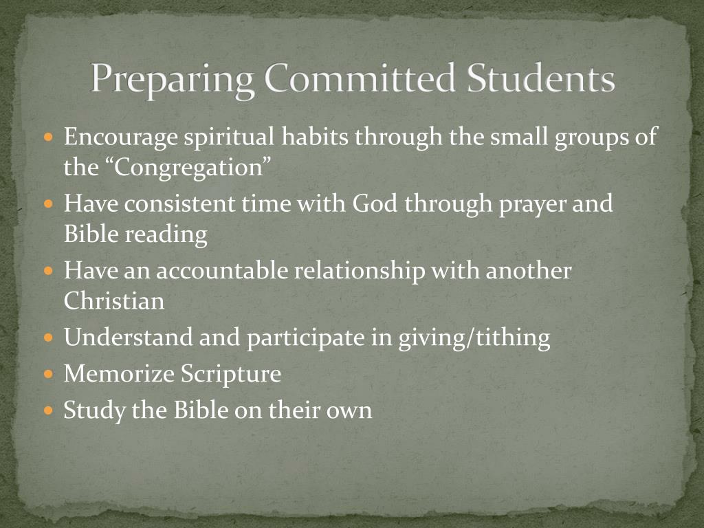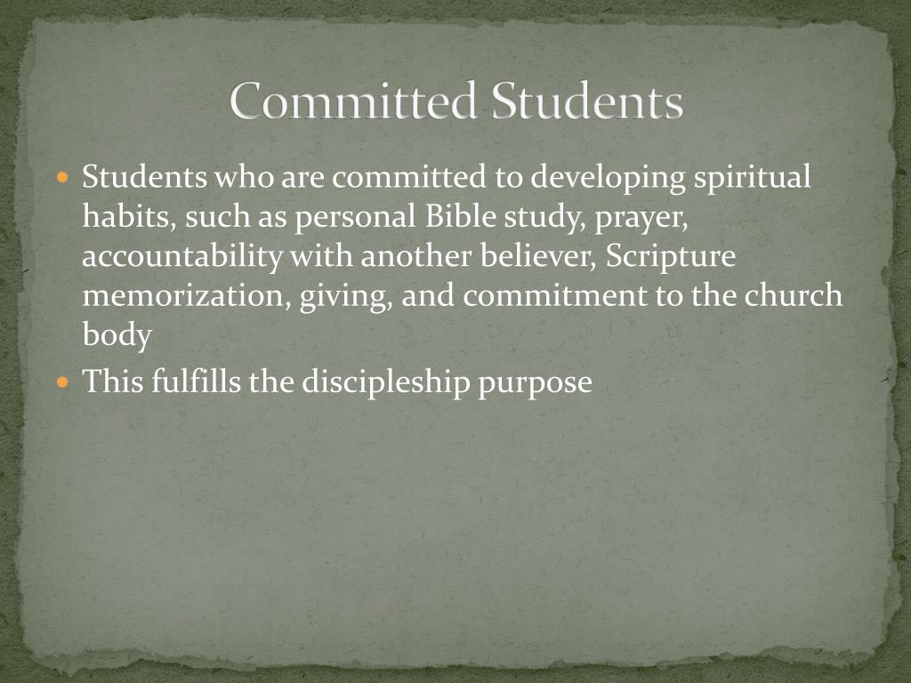Committed Students • Students who are committed to developing spiritual habits, such as personal Bible study, prayer, accountability with another believer, Scripture memorization, giving, and commitment to the church body • This fulfills the discipleship purpose