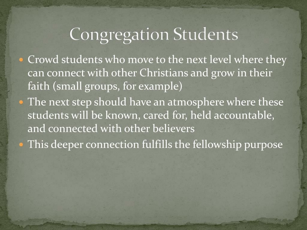 Congregation Students • Crowd students who move to the next level where they can connect with other Christians and grow in their faith (small groups, for example) • The next step should have an atmosphere where these students will be known, cared for, held accountable, and connected with other believers • This deeper connection fulfills the fellowship purpose