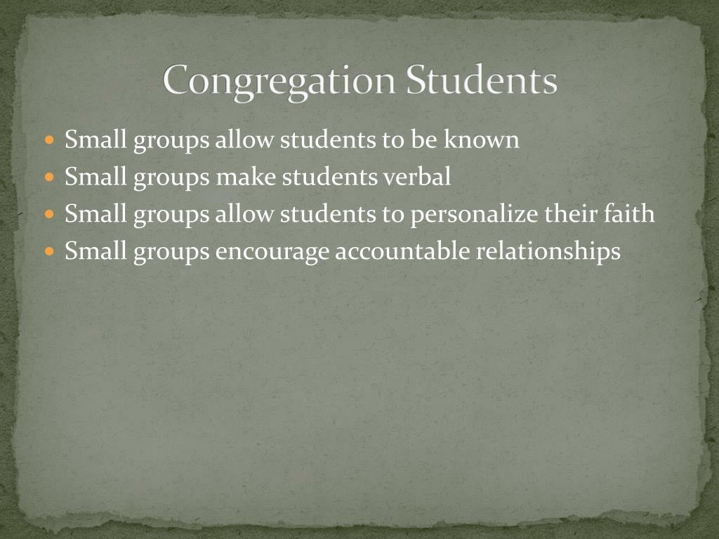 Congregation Students • Small groups allow students to be known • Small groups make students verbal • Small groups allow students to personalize their faith • Small groups encourage accountable relationships