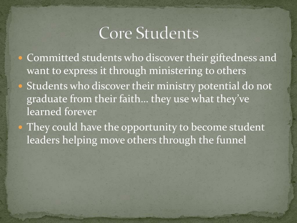 Core Students • Committed students who discover their giftedness and want to express it through ministering to others • Students who discover their ministry potential do not graduate from their faith… they use what they’ve learned forever • They could have the opportunity to become student leaders helping move others through the funnel
