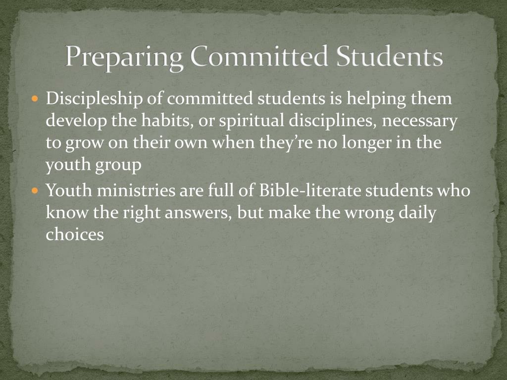 Preparing Committed Students • Discipleship of committed students is helping them develop the habits, or spiritual disciplines, necessary to grow on their own when they’re no longer in the youth group • Youth ministries are full of Bible-literate students who know the right answers, but make the wrong daily choices