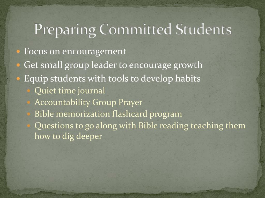 Preparing Committed Students • Focus on encouragement • Get small group leader to encourage growth • Equip students with tools to develop habits • Quiet time journal • Accountability Group Prayer • Bible memorization flashcard program • Questions to go along with Bible reading teaching them how to dig deeper