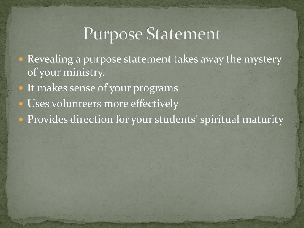 Purpose Statement • Revealing a purpose statement takes away the mystery of your ministry. • It makes sense of your programs • Uses volunteers more effectively • Provides direction for your students’ spiritual maturity
