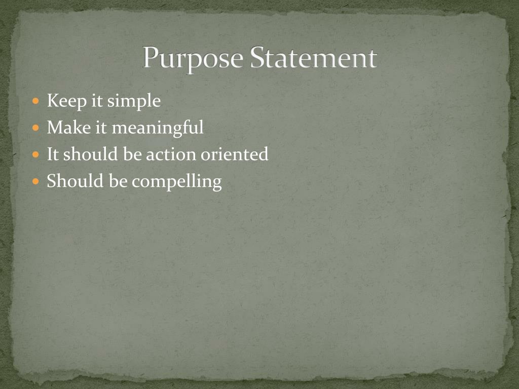 Purpose Statement • Keep it simple • Make it meaningful • It should be action oriented • Should be compelling