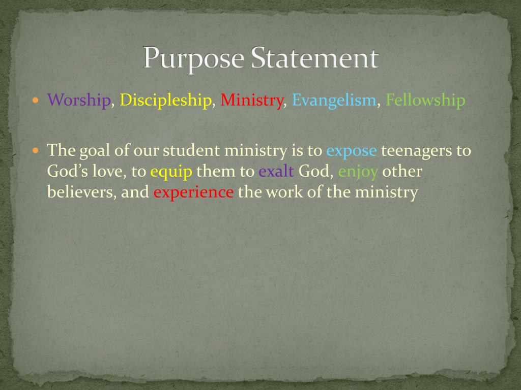 Purpose Statement • Worship, Discipleship, Ministry, Evangelism, Fellowship • The goal of our student ministry is to expose teenagers to God’s love, to equip them to exalt God, enjoy other believers, and experience the work of the ministry