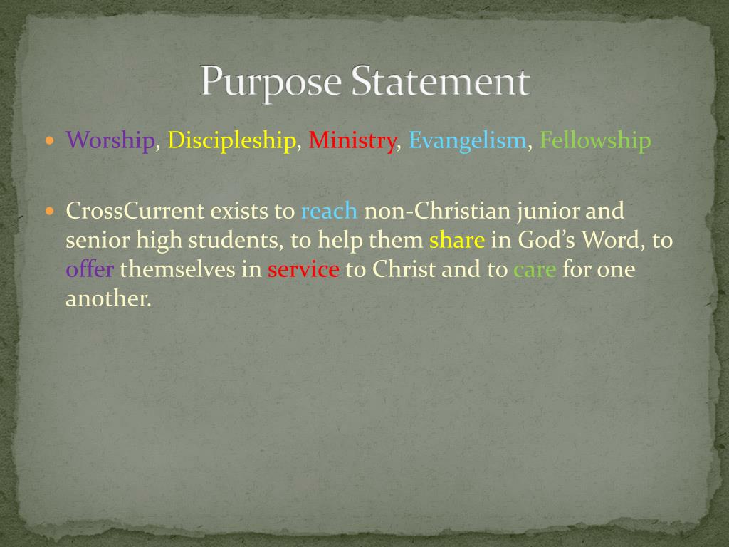 Purpose Statement • Worship, Discipleship, Ministry, Evangelism, Fellowship • CrossCurrentexists to reach non-Christian junior and senior high students, to help them share in God’s Word, to offer themselves in service to Christ and to care for one another.