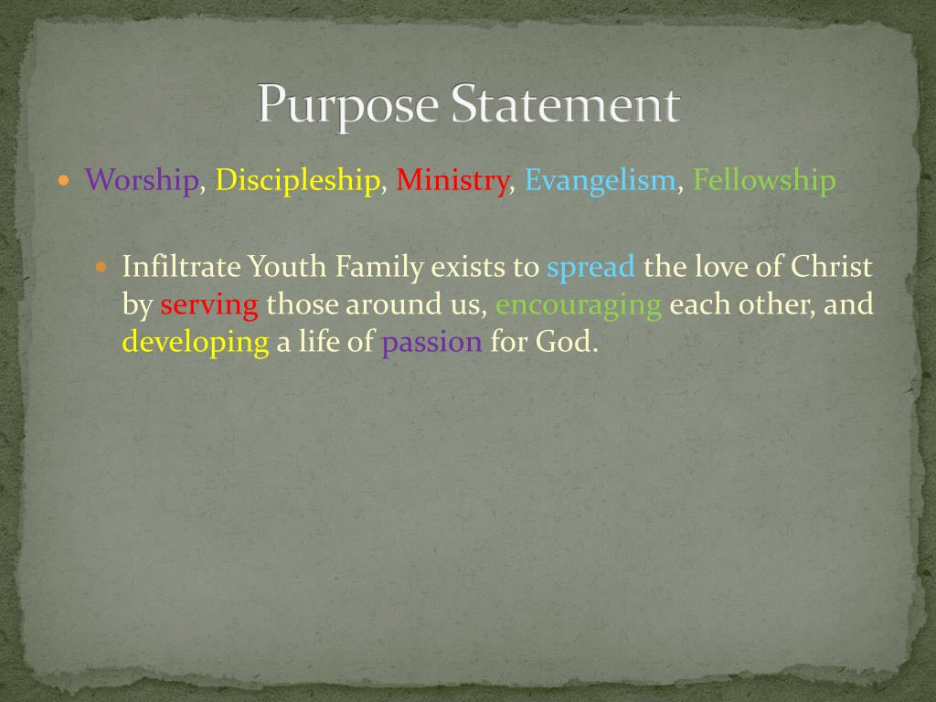Purpose Statement • Worship, Discipleship, Ministry, Evangelism, Fellowship • Infiltrate Youth Family exists to spread the love of Christ by serving those around us, encouraging each other, and developing a life of passion for God.