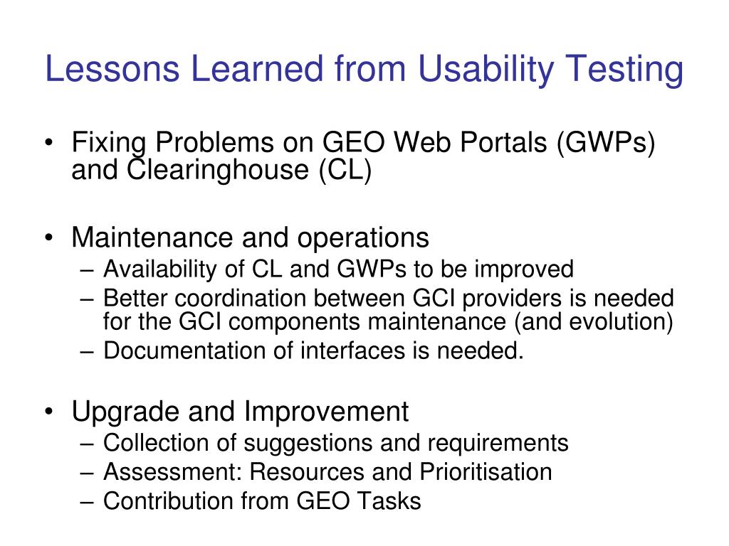 Lessons Learned from Usability Testing • Fixing Problems on GEO Web Portals (GWPs) and Clearinghouse (CL) • Maintenance and operations • Availability of CL and GWPs to be improved • Better coordination between GCI providers is needed for the GCI components maintenance (and evolution) • Documentation of interfaces is needed. • Upgrade and Improvement • Collection of suggestions and requirements • Assessment: Resources and Prioritisation • Contribution from GEO Tasks
