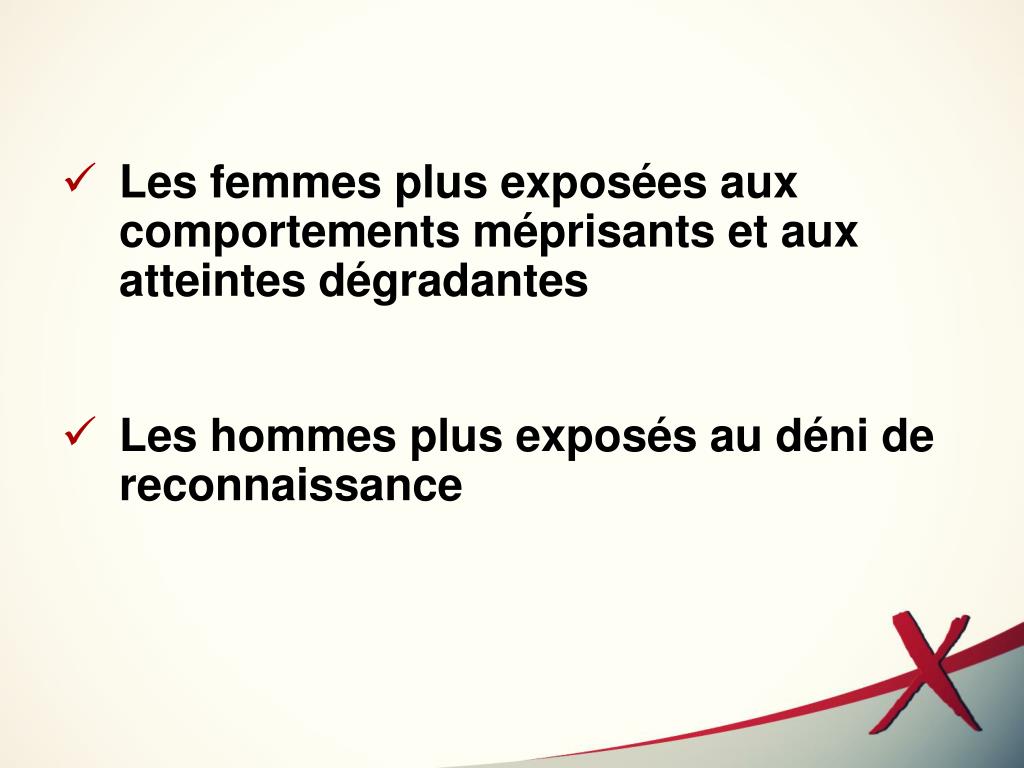 Les femmes plus exposées aux comportements méprisants et aux atteintes dégradantes • Les hommes plus exposés au déni de reconnaissance