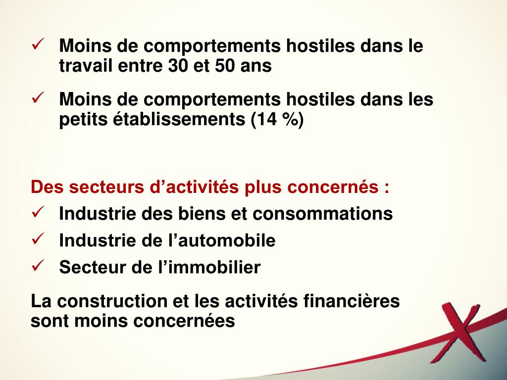 Moins de comportements hostiles dans le travail entre 30 et 50 ans • Moins de comportements hostiles dans les petits établissements (14 %) • Des secteurs d’activités plus concernés : • Industrie des biens et consommations • Industrie de l’automobile • Secteur de l’immobilier • La construction et les activités financièressont moins concernées