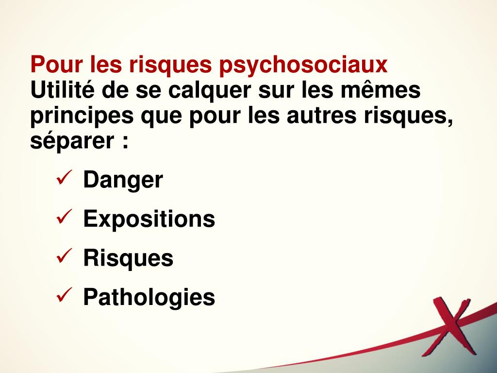 Pour les risques psychosociauxUtilité de se calquer sur les mêmes principes que pour les autres risques, séparer : • Danger • Expositions • Risques • Pathologies