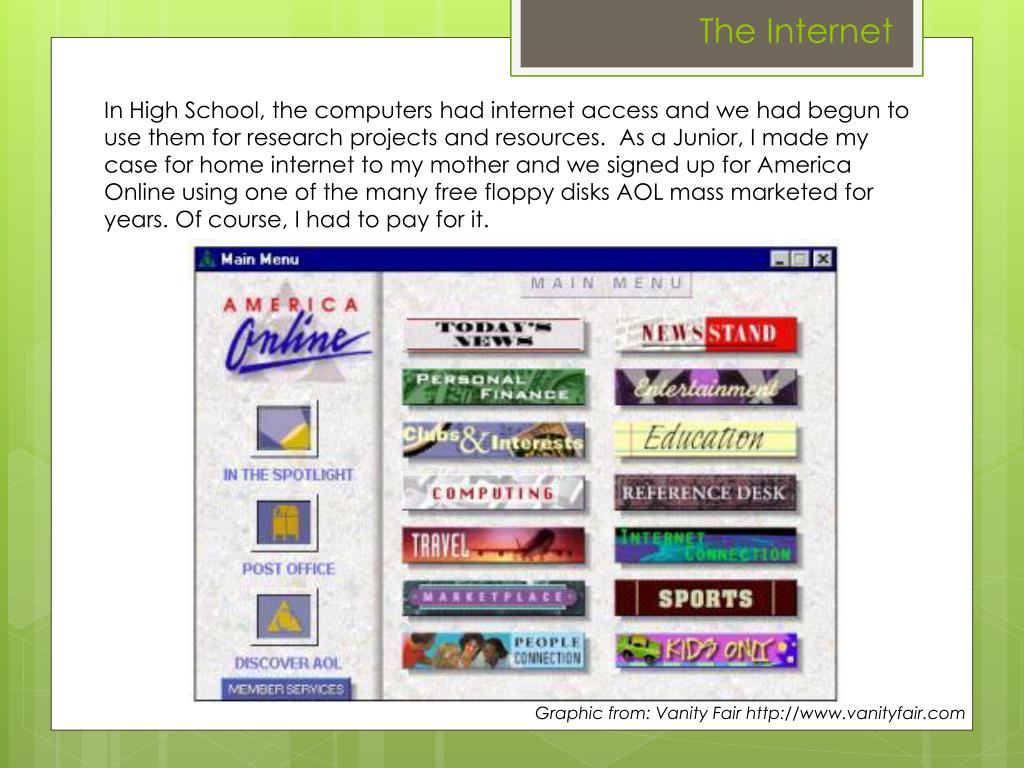 In High School, the computers had internet access and we had begun to use them for research projects and resources. As a Junior, I made my case for home internet to my mother and we signed up for America Online using one of the many free floppy disks AOL mass marketed for years. Of course, I had to pay for it. The Internet Graphic from: Vanity Fair http://www.vanityfair.com