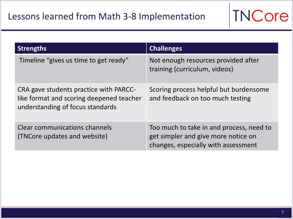 The transition to Common Core Standards is central to strengthening Tennessee’s competitiveness 21% of adults in TN have a college degree Tennessee’s Competitiveness TN ranks 46thin 4th grade math and 41st in 4th grade reading nationally 54% of new jobs will require post-secondary education 16% of high school seniors in TN are college ready Source: “Projections of Jobs and Education Requirements Through 2018” (The Georgetown University Center on Education and the Workforce), 2011 NCES NAEP data, ACT