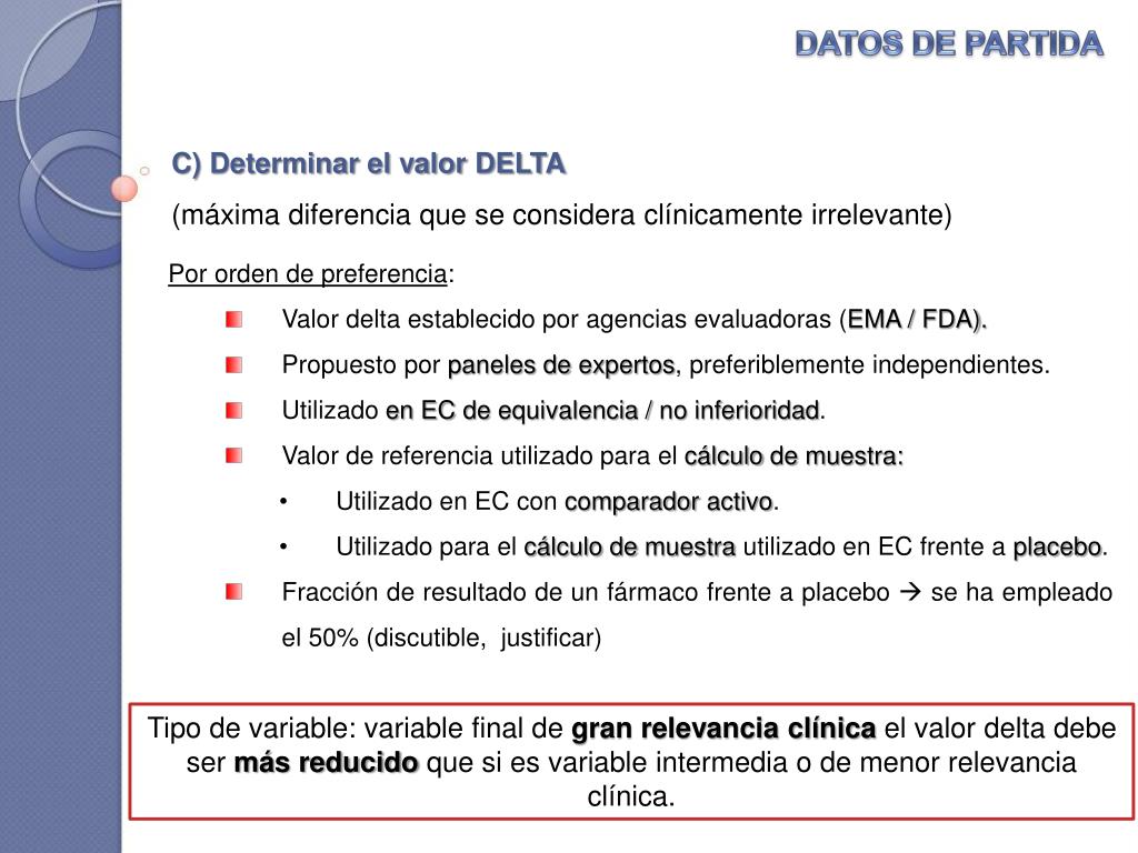 DATOS DE PARTIDA C) Determinar el valor DELTA (máxima diferencia que se considera clínicamente irrelevante) • Por orden de preferencia: • Valor delta establecido por agencias evaluadoras (EMA / FDA). • Propuesto por paneles de expertos, preferiblemente independientes. • Utilizado en EC de equivalencia / no inferioridad. • Valor de referencia utilizado para el cálculo de muestra: • Utilizado en EC con comparador activo. • Utilizado para el cálculo de muestra utilizado en EC frente a placebo. • Fracción de resultado de un fármaco frente a placebo se ha empleado el 50% (discutible, justificar) Tipo de variable: variable final de gran relevancia clínica el valor delta debe ser más reducido que si es variable intermedia o de menor relevancia clínica.