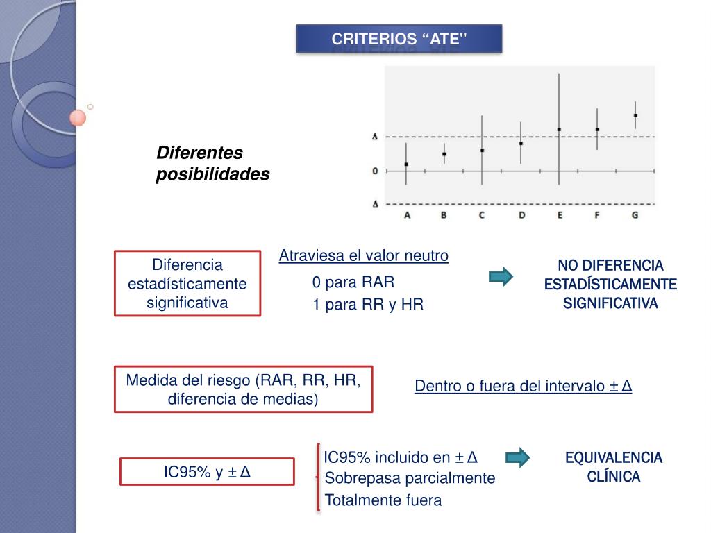 CRITERIOS “ATE" Diferentes posibilidades Atraviesa el valor neutro Diferencia estadísticamente significativa NO DIFERENCIA ESTADÍSTICAMENTE SIGNIFICATIVA 0 para RAR 1 para RR y HR Medida del riesgo (RAR, RR, HR, diferencia de medias) Dentro o fuera del intervalo ± Δ IC95% incluido en ± Δ EQUIVALENCIA CLÍNICA IC95% y ± Δ Sobrepasa parcialmente Totalmente fuera