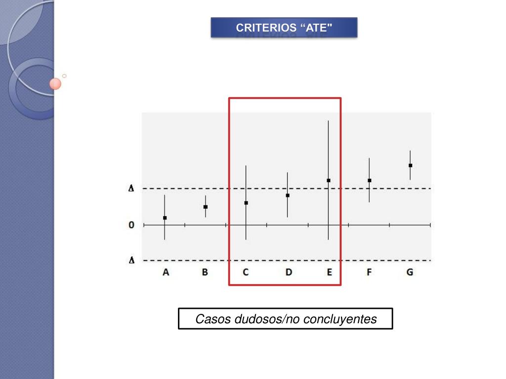 CRITERIOS “ATE" Probable equivalencia clínica • El IC95% sobrepasa el margen de equivalencia • No hay seguridad de que exista diferencia (pues es estadísticamente no significativa) • Probabilidad de diferencia clínicamente relevante es < 50% (la mayor parte del IC está en el rango de equivalencia) ATE Fracaso no comporta perjuicio grave / irreversible No ATE Fracaso SÍ comporta perjuicio grave / irreversible Excepción: probabilidad reducida de resultado fuera de ± Δ (calculadora de Shakespeare et al o por la regla empírica o de las tres sigmas) ATE en mayoría de los pacientes considerar criterios secundarios En todo caso, esta consideración como ATE deber ser bien argumentada Shakespeare TP, Gebski VJ, Veness MJ, Simes J. Improving the interpretation of clinical studies by use of confidence levels, clinical significance curves, and risk-benefit contours. Lancet 2001; 357: 1349-1353.