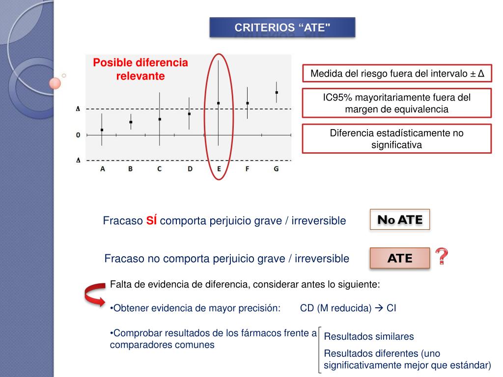 CRITERIOS “ATE" Posible diferencia relevante • Medida del riesgo fuera del intervalo ± Δ • IC95% mayoritariamente fuera del margen de equivalencia • Diferencia estadísticamente no significativa No ATE Fracaso SÍ comporta perjuicio grave / irreversible ? ATE Fracaso no comporta perjuicio grave / irreversible • Falta de evidencia de diferencia, considerar antes lo siguiente: • Obtener evidencia de mayor precisión: CD (M reducida) CI • Comprobar resultados de los fármacos frente a comparadores comunes Resultados similares Resultados diferentes (uno significativamente mejor que estándar)