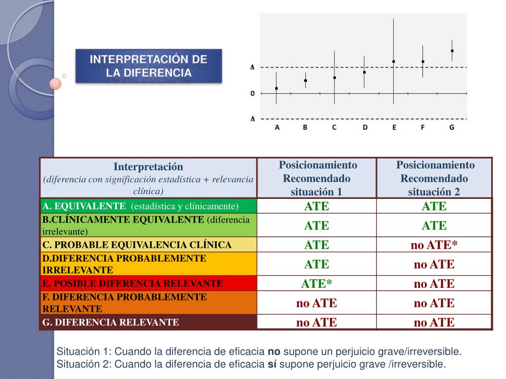 INTERPRETACIÓN DE LA DIFERENCIA Situación 1: Cuando la diferencia de eficacia no supone un perjuicio grave/irreversible. Situación 2: Cuando la diferencia de eficacia sí supone perjuicio grave /irreversible.