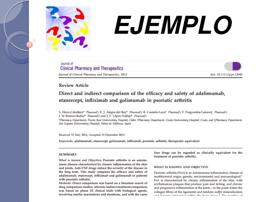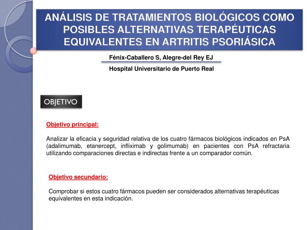 ANÁLISIS DE TRATAMIENTOS BIOLÓGICOS COMO POSIBLES ALTERNATIVAS TERAPÉUTICAS EQUIVALENTES EN ARTRITIS PSORIÁSICA Fénix-Caballero S, Alegre-del Rey EJ Hospital Universitario de Puerto Real OBJETIVO Objetivo principal: Analizar la eficacia y seguridad relativa de los cuatro fármacos biológicos indicados en PsA (adalimumab, etanercept, infliximab y golimumab) en pacientes con PsA refractaria utilizando comparaciones directas e indirectas frente a un comparador común. Objetivo secundario: Comprobar si estos cuatro fármacos pueden ser considerados alternativas terapéuticas equivalentes en esta indicación.