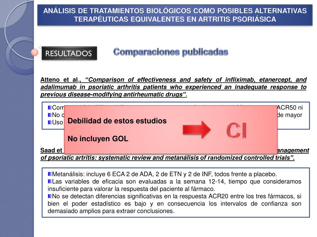 ANÁLISIS DE TRATAMIENTOS BIOLÓGICOS COMO POSIBLES ALTERNATIVAS TERAPÉUTICAS EQUIVALENTES EN ARTRITIS PSORIÁSICA Comparaciones publicadas RESULTADOS Atteno et al., “Comparison of effectiveness and safety of infliximab, etanercept, and adalimumab in psoriatic arthritis patients who experienced an inadequate response to previous disease-modifying antirheumatic drugs”. Compara ADA, ETN e INF. No ciego, (N=100 pacientes). Uso discrecional de MTX, que favorece a INF. Se determina ACR20, pero no ACR50 ni ACR70, variables consideradas de mayor relevancia clínica. Debilidad de estos estudios No incluyen GOL CI Saad et al., “Risks and benefits of tumor necrosis factor-alpha inhibitors in the Management of psoriatic artritis: systematic review and metanálisis of randomized controlled trials”. • Metanálisis: incluye 6 ECA 2 de ADA, 2 de ETN y 2 de INF, todos frente a placebo. • Las variables de eficacia son evaluadas a la semana 12-14, tiempo que consideramos insuficiente para valorar la respuesta del paciente al fármaco. • No se detectan diferencias significativas en la respuesta ACR20 entre los tres fármacos, si bien el poder estadístico es bajo y en consecuencia los intervalos de confianza son demasiado amplios para extraer conclusiones.