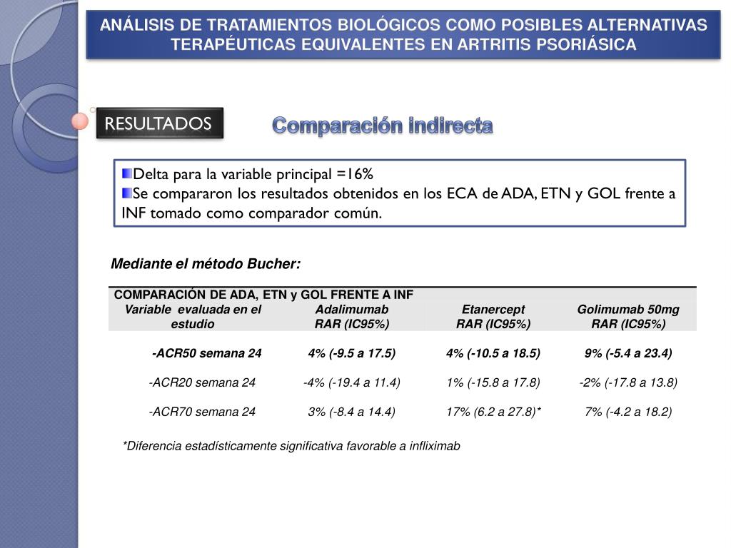 ANÁLISIS DE TRATAMIENTOS BIOLÓGICOS COMO POSIBLES ALTERNATIVAS TERAPÉUTICAS EQUIVALENTES EN ARTRITIS PSORIÁSICA RESULTADOS Comparación indirecta Delta para la variable principal =16% Se compararon los resultados obtenidos en los ECA de ADA, ETN y GOL frente a INF tomado como comparador común. Mediante el método Bucher: *Diferencia estadísticamente significativa favorable a infliximab