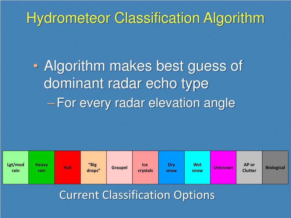 Hydrometeor Classification Algorithm Lgt/mod rain Heavy rain Hail “Big drops” Graupel Ice crystals Dry snow Wet snow Unknown AP or Clutter Biological Current Classification Options • Algorithm makes best guess of dominant radar echo type • For every radar elevation angle