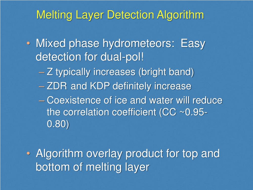 Melting Layer Detection Algorithm • Mixed phase hydrometeors: Easy detection for dual-pol! • Z typically increases (bright band) • ZDRand KDP definitely increase • Coexistence of ice and water will reduce the correlation coefficient (CC ~0.95-0.80) • Algorithm overlay product for top and bottom of melting layer
