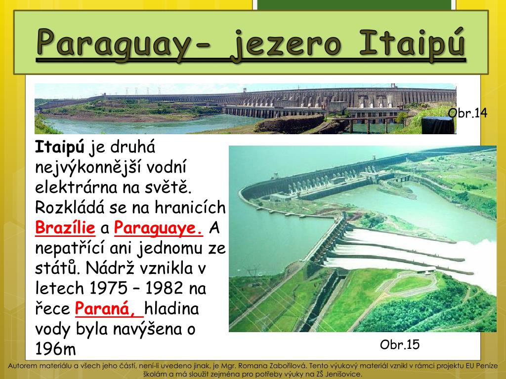 Paraguay- jezero Itaipú Obr.14 Itaipú je druhá nejvýkonnější vodní elektrárna na světě.Rozkládá se na hranicích Brazílie a Paraguaye. A nepatřící ani jednomu ze států. Nádrž vznikla v letech 1975 – 1982 na řece Paraná, hladina vody byla navýšena o 196m Obr.15 Autorem materiálu a všech jeho částí, není-li uvedeno jinak, je Mgr. Romana Zabořilová. Tento výukový materiál vznikl v rámci projektu EU Peníze školám a má sloužit zejména pro potřeby výuky na ZŠ Jenišovice.