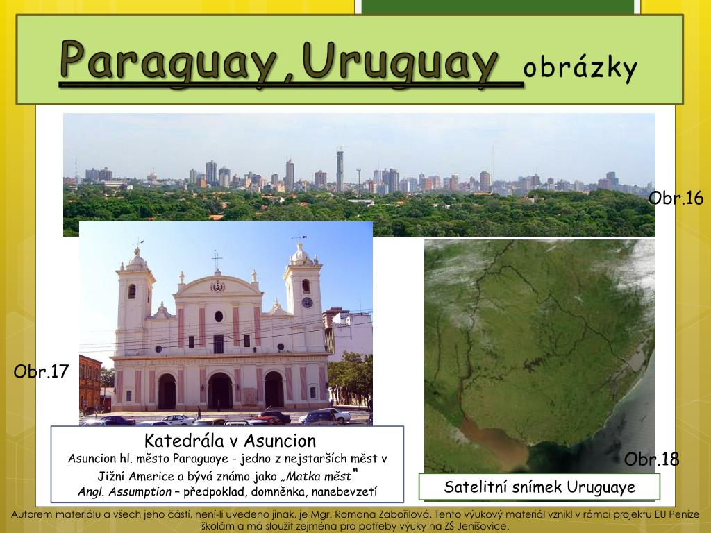Paraguay,Uruguayobrázky Obr.16 Obr.17 Katedrála v Asuncion Asuncion hl. město Paraguaye - jedno z nejstarších měst v Jižní Americe a bývá známo jako „Matka měst“ Angl. Assumption – předpoklad, domněnka, nanebevzetí Obr.18 Satelitní snímek Uruguaye Autorem materiálu a všech jeho částí, není-li uvedeno jinak, je Mgr. Romana Zabořilová. Tento výukový materiál vznikl v rámci projektu EU Peníze školám a má sloužit zejména pro potřeby výuky na ZŠ Jenišovice.