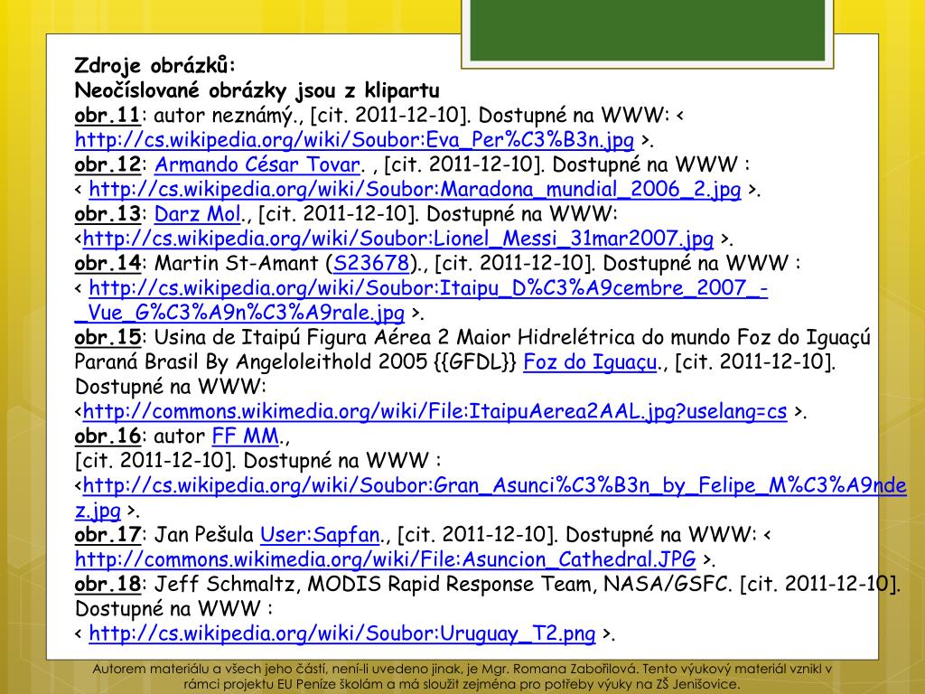 Zdroje obrázků: Neočíslované obrázky jsou z klipartu obr.11: autor neznámý., [cit. 2011-12-10].Dostupné na WWW: < http://cs.wikipedia.org/wiki/Soubor:Eva_Per%C3%B3n.jpg>. obr.12: Armando César Tovar. , [cit. 2011-12-10]. Dostupné na WWW : <http://cs.wikipedia.org/wiki/Soubor:Maradona_mundial_2006_2.jpg>. obr.13: Darz Mol., [cit. 2011-12-10]. Dostupné na WWW: <http://cs.wikipedia.org/wiki/Soubor:Lionel_Messi_31mar2007.jpg>. obr.14: Martin St-Amant (S23678)., [cit. 2011-12-10]. Dostupné na WWW : <http://cs.wikipedia.org/wiki/Soubor:Itaipu_D%C3%A9cembre_2007_-_Vue_G%C3%A9n%C3%A9rale.jpg>. obr.15: Usina de Itaipú Figura Aérea 2 Maior Hidrelétrica do mundo Foz do Iguaçú Paraná Brasil By Angeloleithold 2005 {{GFDL}} Foz do Iguaçu., [cit. 2011-12-10]. Dostupné na WWW: <http://commons.wikimedia.org/wiki/File:ItaipuAerea2AAL.jpg?uselang=cs>. obr.16: autor FF MM., [cit. 2011-12-10]. Dostupné na WWW : <http://cs.wikipedia.org/wiki/Soubor:Gran_Asunci%C3%B3n_by_Felipe_M%C3%A9ndez.jpg>. obr.17: Jan PešulaUser:Sapfan., [cit. 2011-12-10]. Dostupné na WWW: < http://commons.wikimedia.org/wiki/File:Asuncion_Cathedral.JPG>. obr.18: JeffSchmaltz, MODIS Rapid Response Team, NASA/GSFC.[cit. 2011-12-10]. Dostupné na WWW : <http://cs.wikipedia.org/wiki/Soubor:Uruguay_T2.png>. Autorem materiálu a všech jeho částí, není-li uvedeno jinak, je Mgr. Romana Zabořilová. Tento výukový materiál vznikl v rámci projektu EU Peníze školám a má sloužit zejména pro potřeby výuky na ZŠ Jenišovice.
