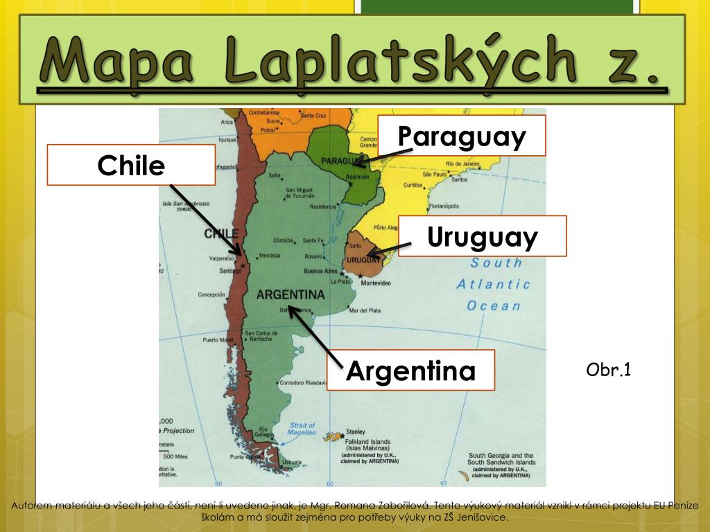 Mapa Laplatských z. Paraguay Chile Uruguay Argentina Obr.1 Autorem materiálu a všech jeho částí, není-li uvedeno jinak, je Mgr. Romana Zabořilová. Tento výukový materiál vznikl v rámci projektu EU Peníze školám a má sloužit zejména pro potřeby výuky na ZŠ Jenišovice.