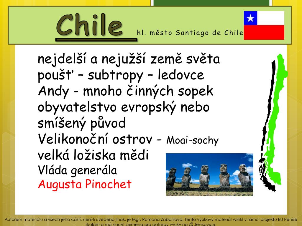 Chile hl. město Santiago de Chile nejdelší a nejužší země světa poušť – subtropy – ledovce Andy - mnoho činných sopek obyvatelstvo evropský nebo smíšený původ Velikonoční ostrov - Moai-sochy velká ložiska mědi Vláda generála Augusta Pinochet Autorem materiálu a všech jeho částí, není-li uvedeno jinak, je Mgr. Romana Zabořilová. Tento výukový materiál vznikl v rámci projektu EU Peníze školám a má sloužit zejména pro potřeby výuky na ZŠ Jenišovice.