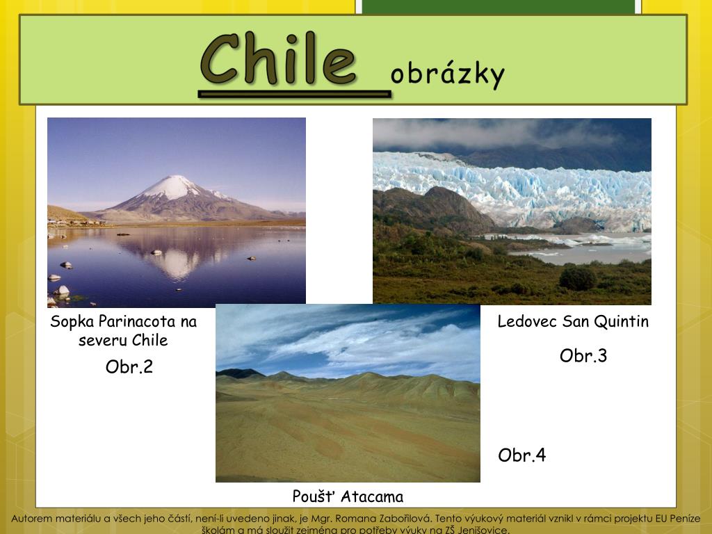 Chile obrázky Sopka Parinacota na severu Chile Ledovec San Quintin Obr.3 Obr.2 Obr.4 Poušť Atacama Autorem materiálu a všech jeho částí, není-li uvedeno jinak, je Mgr. Romana Zabořilová. Tento výukový materiál vznikl v rámci projektu EU Peníze školám a má sloužit zejména pro potřeby výuky na ZŠ Jenišovice.