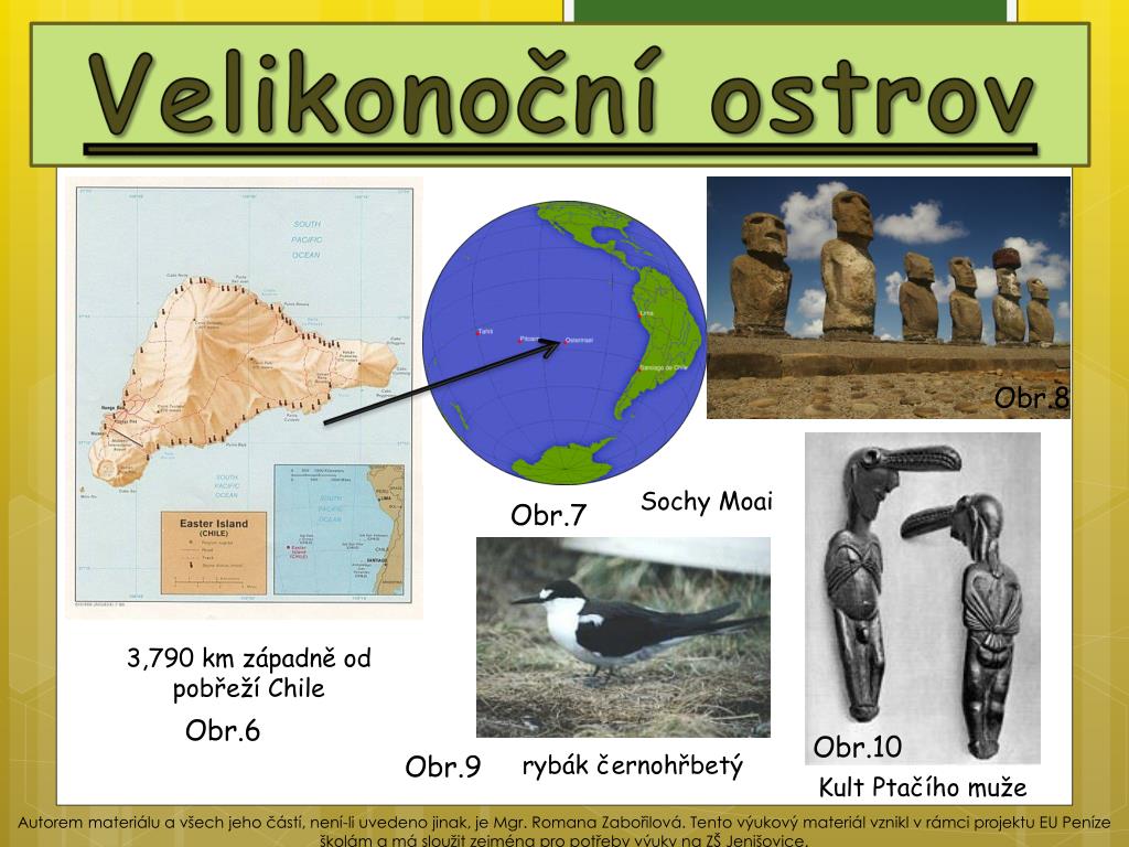 Velikonoční ostrov Obr.8 Sochy Moai Obr.7 3,790 km západně od pobřeží Chile Obr.6 Obr.10 Obr.9 rybák černohřbetý Kult Ptačího muže Autorem materiálu a všech jeho částí, není-li uvedeno jinak, je Mgr. Romana Zabořilová. Tento výukový materiál vznikl v rámci projektu EU Peníze školám a má sloužit zejména pro potřeby výuky na ZŠ Jenišovice.