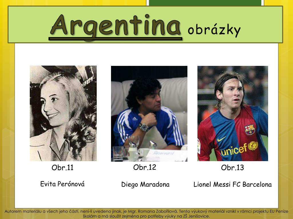 Argentinaobrázky Obr.12 Obr.11 Obr.13 Evita Perónová Diego Maradona LionelMessiFC Barcelona Autorem materiálu a všech jeho částí, není-li uvedeno jinak, je Mgr. Romana Zabořilová. Tento výukový materiál vznikl v rámci projektu EU Peníze školám a má sloužit zejména pro potřeby výuky na ZŠ Jenišovice.