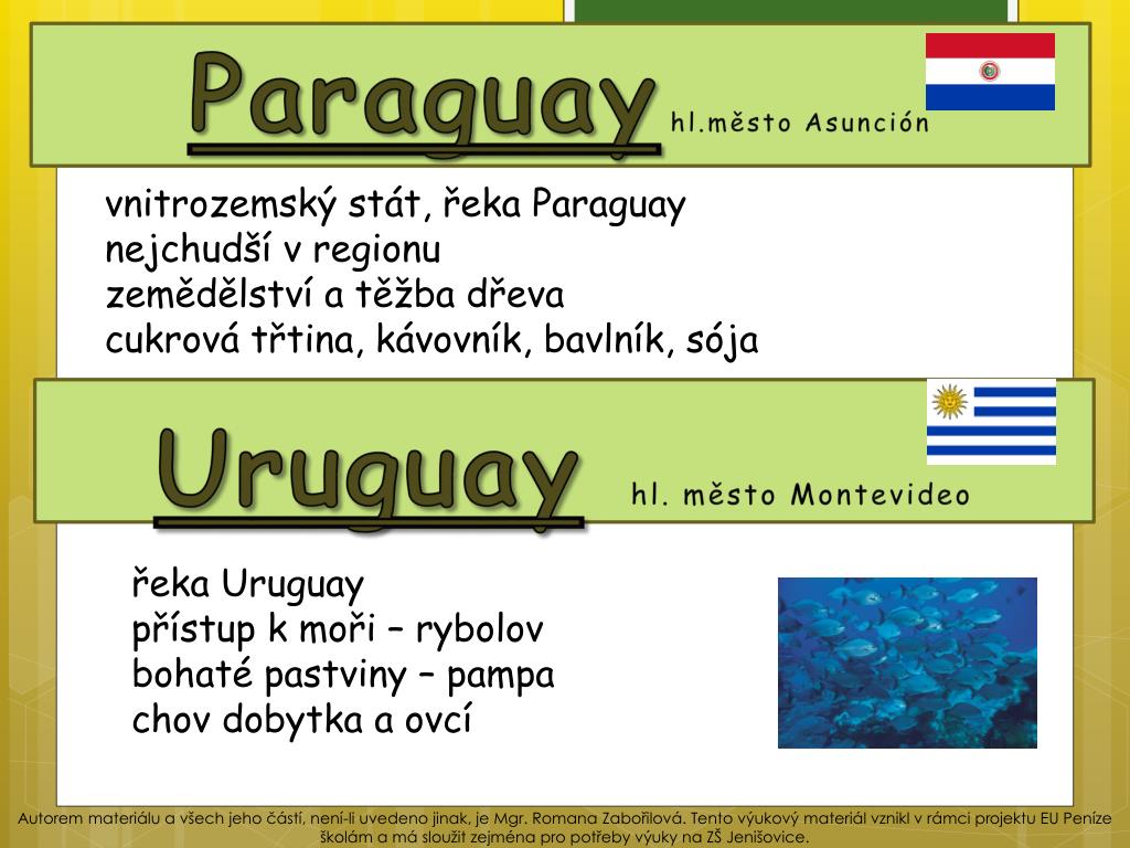 Paraguayhl.městoAsunción vnitrozemský stát, řeka Paraguay nejchudší v regionu zemědělství a těžba dřeva cukrová třtina, kávovník, bavlník, sója Uruguayhl. město Montevideo řeka Uruguay přístup k moři – rybolov bohaté pastviny – pampa chov dobytka a ovcí Autorem materiálu a všech jeho částí, není-li uvedeno jinak, je Mgr. Romana Zabořilová. Tento výukový materiál vznikl v rámci projektu EU Peníze školám a má sloužit zejména pro potřeby výuky na ZŠ Jenišovice.
