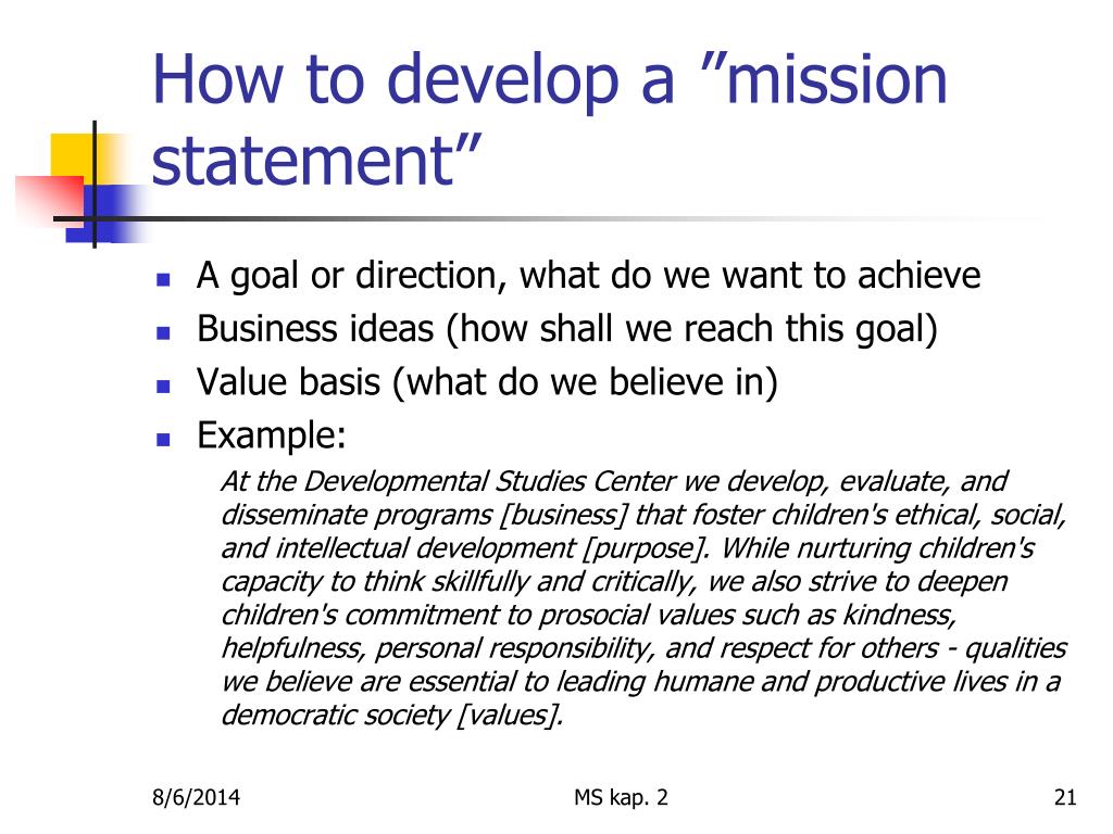 How to develop a ”mission statement” • A goal or direction, what do we want to achieve • Business ideas (how shall we reach this goal) • Value basis (what do we believe in) • Example: At the Developmental Studies Center we develop, evaluate, and disseminate programs [business] that foster children's ethical, social, and intellectual development [purpose]. While nurturing children's capacity to think skillfully and critically, we also strive to deepen children's commitment to prosocial values such as kindness, helpfulness, personal responsibility, and respect for others - qualities we believe are essential to leading humane and productive lives in a democratic society [values]. MS kap. 2