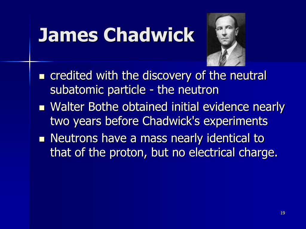 James Chadwick • credited with the discovery of the neutral subatomic particle - the neutron • Walter Bothe obtained initial evidence nearly two years before Chadwick's experiments • Neutrons have a mass nearly identical to that of the proton, but no electrical charge.