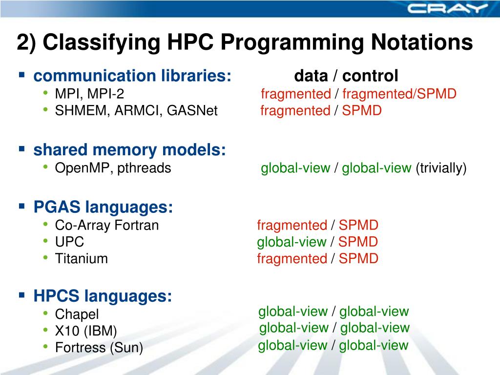 2) Classifying HPC Programming Notations • communication libraries: data / control • MPI, MPI-2 fragmented / fragmented/SPMD • SHMEM, ARMCI, GASNet fragmented / SPMD • shared memory models: • OpenMP global-view / global-view (trivially) • PGAS languages: • Co-Array Fortran fragmented / SPMD • UPC global-view/ SPMD • Titanium fragmented / SPMD • global-view / global-view • global-view / global-view • global-view / global-view • communication libraries: • MPI, MPI-2 • SHMEM, ARMCI, GASNet • shared memory models: • OpenMP, pthreads • PGAS languages: • Co-Array Fortran • UPC • Titanium • HPCS languages: • Chapel • X10 (IBM) • Fortress (Sun)