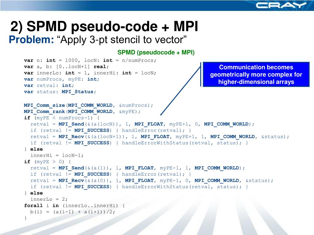 2) SPMD pseudo-code + MPI Problem: “Apply 3-pt stencil to vector” SPMD (pseudocode + MPI) var n: int = 1000, locN: int = n/numProcs; var a, b: [0..locN+1] real; varinnerLo:int = 1, innerHi: int = locN; varnumProcs, myPE: int; varretval: int; var status: MPI_Status; MPI_Comm_size(MPI_COMM_WORLD, &numProcs); MPI_Comm_rank(MPI_COMM_WORLD, &myPE); if (myPE < numProcs-1) { retval = MPI_Send(&(a(locN)), 1, MPI_FLOAT, myPE+1, 0, MPI_COMM_WORLD); if (retval != MPI_SUCCESS) { handleError(retval); } retval = MPI_Recv(&(a(locN+1)), 1, MPI_FLOAT, myPE+1, 1, MPI_COMM_WORLD, &status); if (retval != MPI_SUCCESS) { handleErrorWithStatus(retval, status); } } else innerHi = locN-1; if (myPE > 0) { retval = MPI_Send(&(a(1)), 1, MPI_FLOAT, myPE-1, 1, MPI_COMM_WORLD); if (retval != MPI_SUCCESS) { handleError(retval); } retval = MPI_Recv(&(a(0)), 1, MPI_FLOAT, myPE-1, 0, MPI_COMM_WORLD, &status); if (retval != MPI_SUCCESS) { handleErrorWithStatus(retval, status); } } else innerLo = 2; foralliin (innerLo..innerHi) { b(i) = (a(i-1) + a(i+1))/2; } Communication becomes geometrically more complex for higher-dimensional arrays