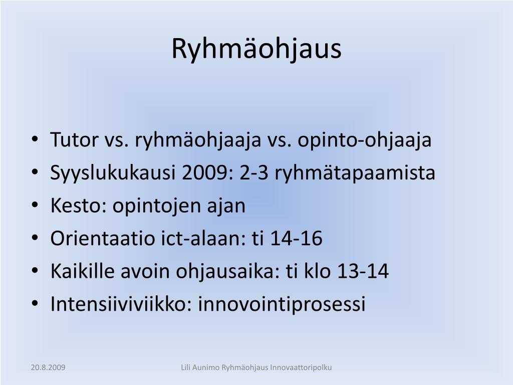 Ryhmäohjaus • Tutor vs. ryhmäohjaaja vs. opinto-ohjaaja • Syyslukukausi 2009: 2-3 ryhmätapaamista • Kesto: opintojen ajan • Orientaatio ict-alaan: ti 14-16 • Kaikille avoin ohjausaika: ti klo 13-14 • Intensiiviviikko: innovointiprosessi Lili Aunimo Ryhmäohjaus Innovaattoripolku